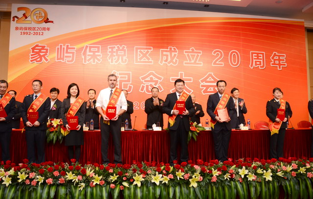 11月28日上午,在慶祝廈門象嶼保稅區(qū)成立20周年的喜慶日子里,廈門市委、市政府隆重舉行慶祝大會(huì),回顧保稅區(qū)20年的奮斗歷程,總結(jié)保稅區(qū)20年的發(fā)展經(jīng)驗(yàn),展望保稅區(qū)更加美好的發(fā)展未來。為保稅區(qū)建設(shè)立下汗馬功勞的10家突出貢獻(xiàn)企業(yè)和10位突出貢獻(xiàn)個(gè)人受到了隆重表彰。其中,廈門象嶼集團(tuán)有限公司、廈門象嶼股份有限公司榮獲突出貢獻(xiàn)企業(yè),象嶼集團(tuán)黨委書記、董事長(zhǎng)王龍雛,象嶼建設(shè)集團(tuán)常務(wù)副總經(jīng)理王澍陶榮獲突出貢獻(xiàn)個(gè)人。