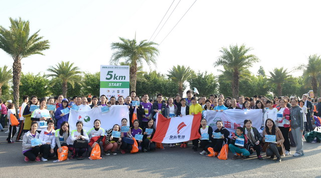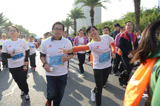 盡管冬日清晨有些凍人,但這絲毫沒有“凍”壞象嶼人的熱情。一進(jìn)入賽場,大家就摩拳擦掌,躍躍欲試。今年的馬拉松對象嶼跑團(tuán)而言,有著特殊的意義,這不僅是一場健康跑,更是一場公益跑。此次比賽跑道恰好與火燒嶼隔海相望,由集團(tuán)捐資建立的中華白海豚救護(hù)繁育基地正坐落島上。白海豚的可愛形象也隨之出現(xiàn)在象嶼“跑男”“跑女”的前胸、后背。公益旗幟、白海豚公益宣傳貼紙,紅帆logo,以及我們朝氣蓬勃的象嶼跑團(tuán)組成了一道“有愛”的風(fēng)景線。這也吸引了周圍許多馬拉松參賽者的目光,有的參賽者甚至圍上前來詢問是否也能加入其中。于是,象嶼救助白海豚的公益之舉隨著象嶼人的奔跑也一路傳播開來。