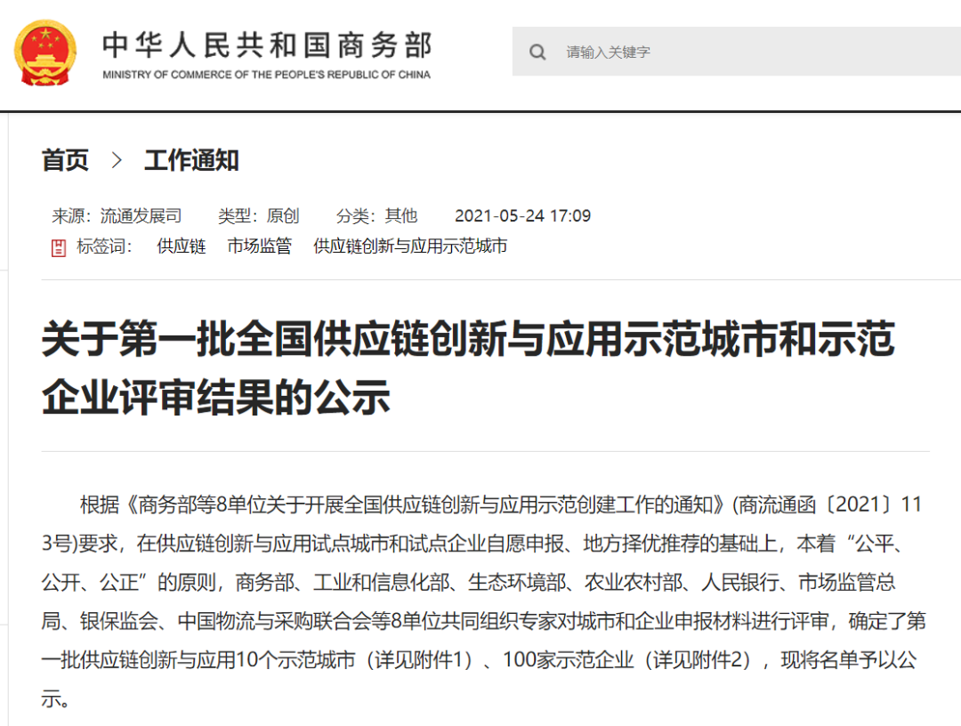 商務部此次公示的“全國供應鏈創(chuàng)新與應用示范城市和示范企業(yè)評審結果”,是商務部、工業(yè)和信息化部、生態(tài)環(huán)境部、農(nóng)業(yè)農(nóng)村部、人民銀行、市場監(jiān)管總局、銀保監(jiān)會、中國物流與采購聯(lián)合會等8單位共同組織專家對城市和企業(yè)申報材料進行評審確定的結果。